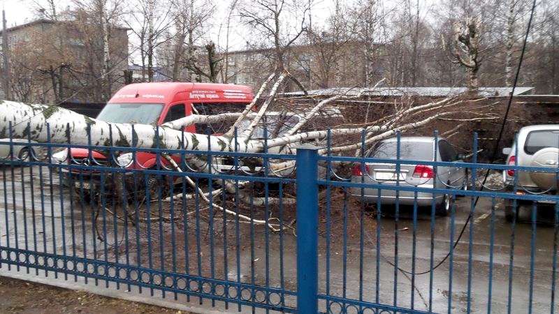 Вероятно в один из таких порывов береза, росшая неподалеку от дома № 14 на улице Уральской, не выдержала и повалилась на припаркованные автомобили. Часть веток обрушилась на забор, отделяющий территорию детского сада от стоянки.